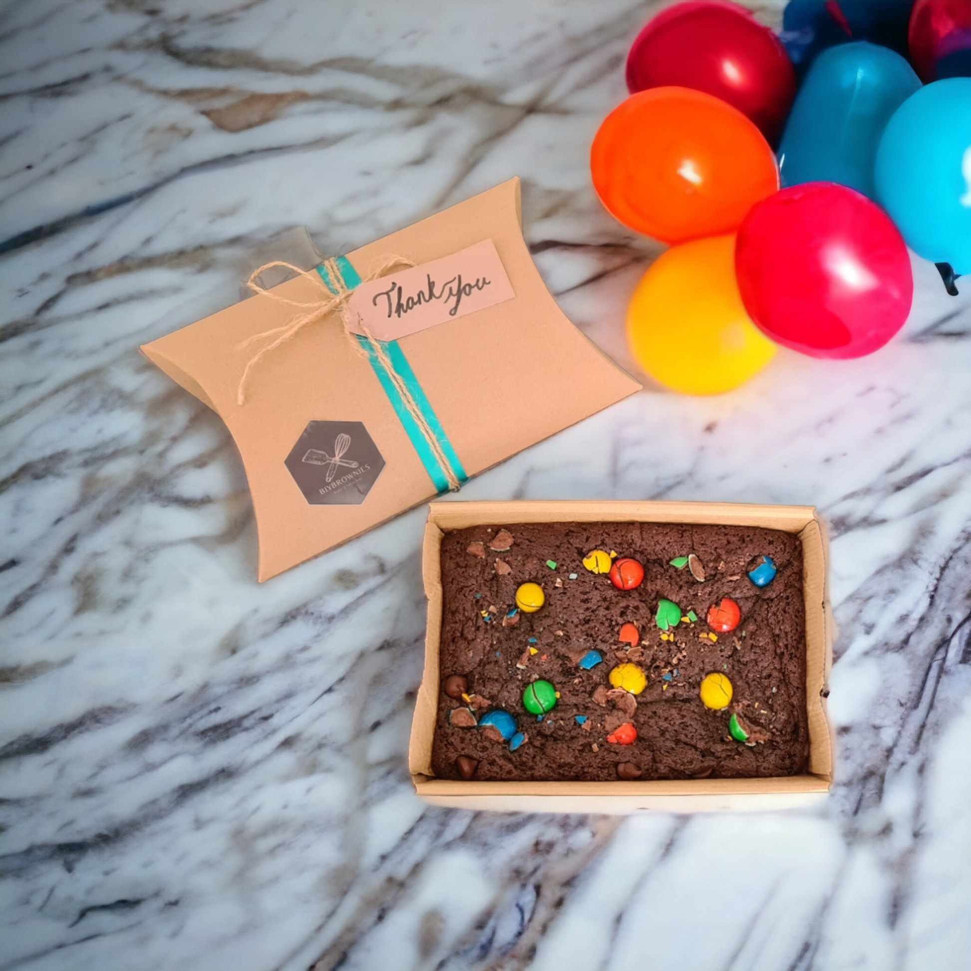Thank you Gift box includes a pack of brownie mix, with a choice of chocolate chips and toppings and a disposable tray for baking; wrapped with a ribbon and gift tag.