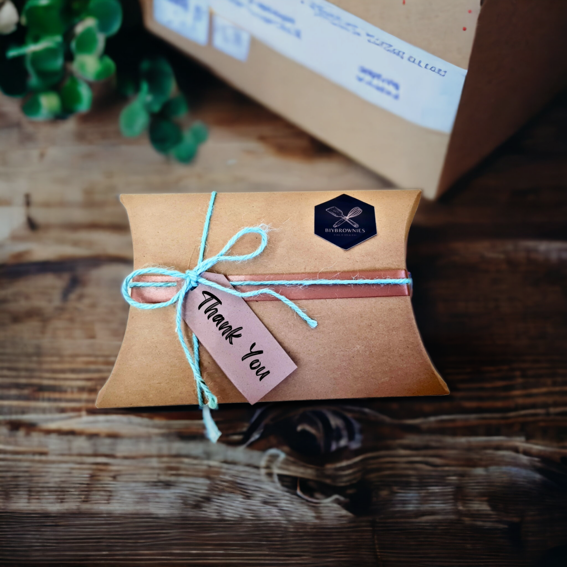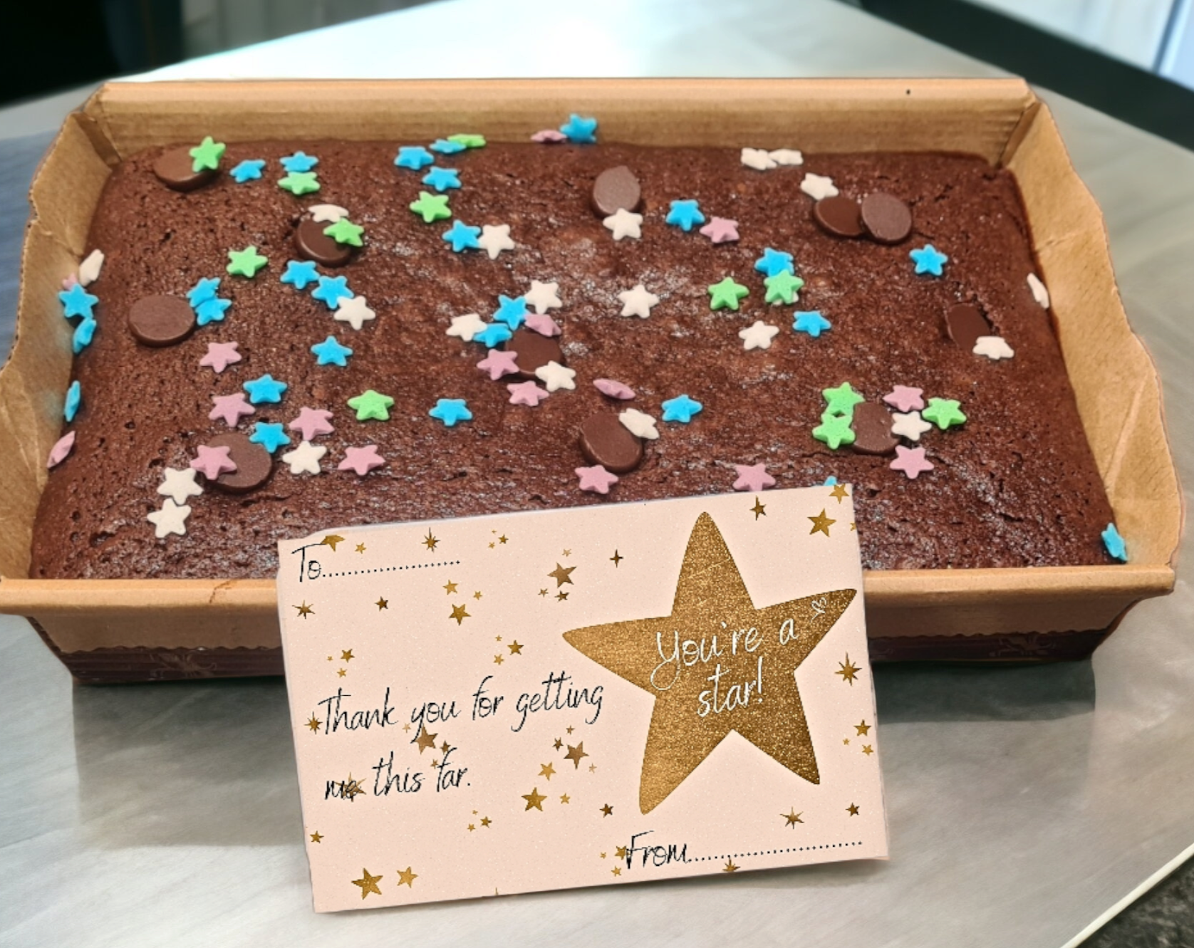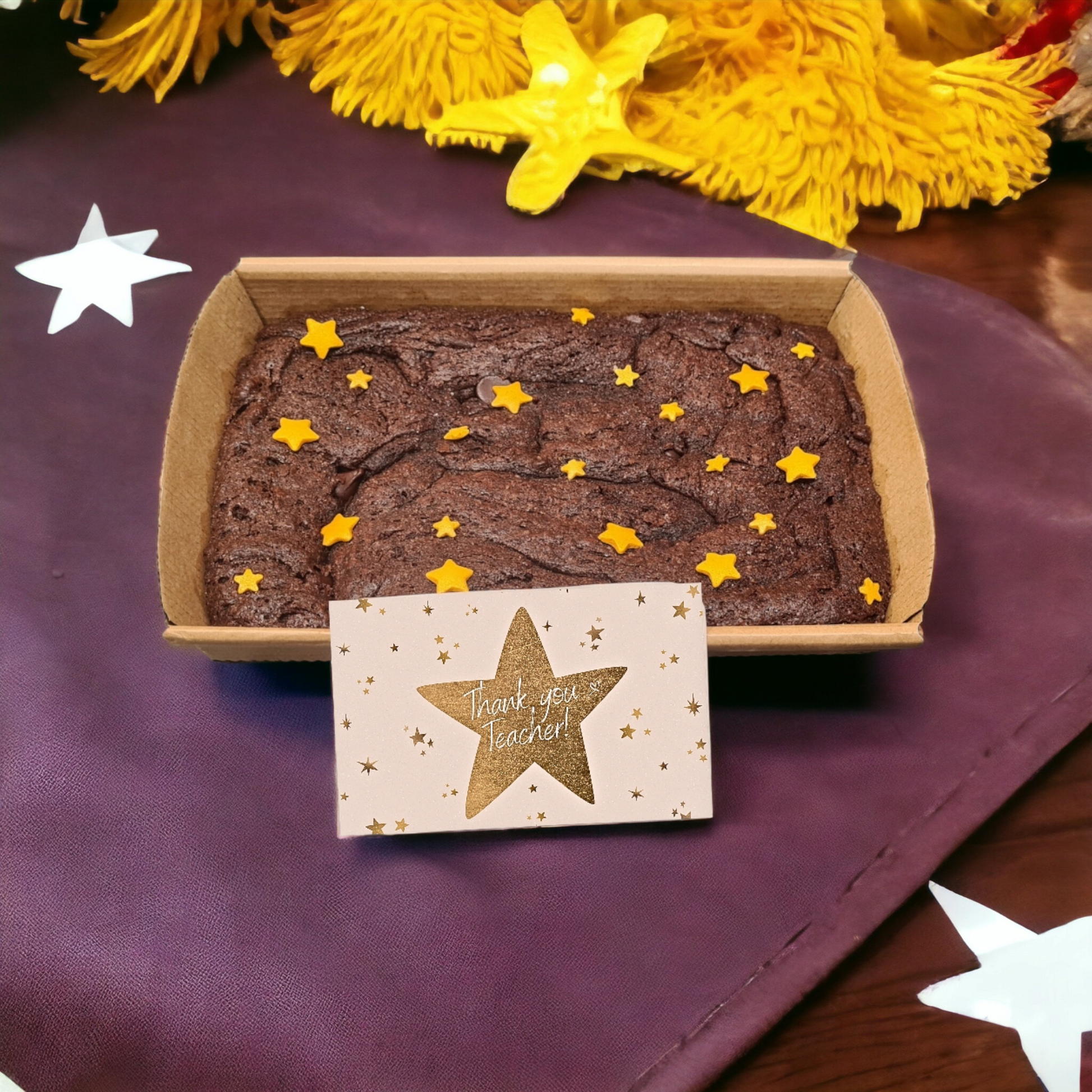 Get a pack of brownie mix, with a choice of chocolate chips and toppings. Individually packed with a disposable tray for baking, wrapped with a ribbon and gift card.